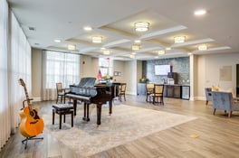 This common space features a dedicated music area where residents can enjoy sing-alongs, performances, or quiet moments with their favorite tunes. It’s a welcoming spot that brings energy and connection to the community.