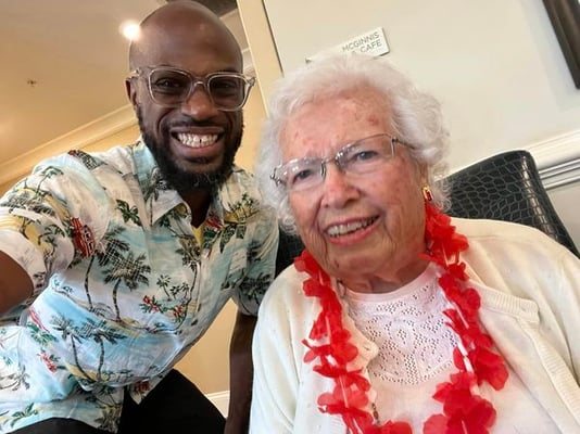 Arbor Terrace employee smiling dancing with resident on patio