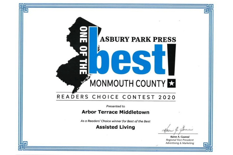 “The Asbury Park Press,” a long-standing daily publication in Monmouth and Ocean counties, recently announced its annual Best of Best awards for local businesses across various industries. We’re proud to share that Arbor Terrace Middletown was named Monmouth County’s Readers’ Choice Best of the Best in Assisted Living and Adult Community.