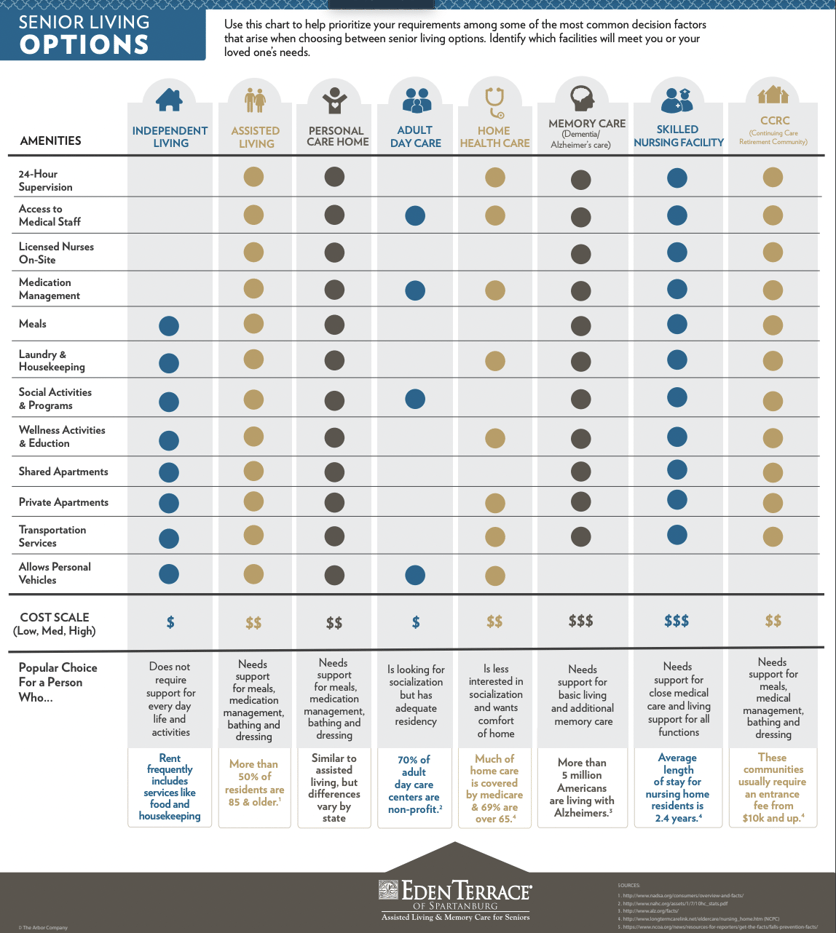 When it comes to senior living, the options can seem endless. We created this chart to help you understand the different levels of care, and identify which best fits your or your loved one's needs.
